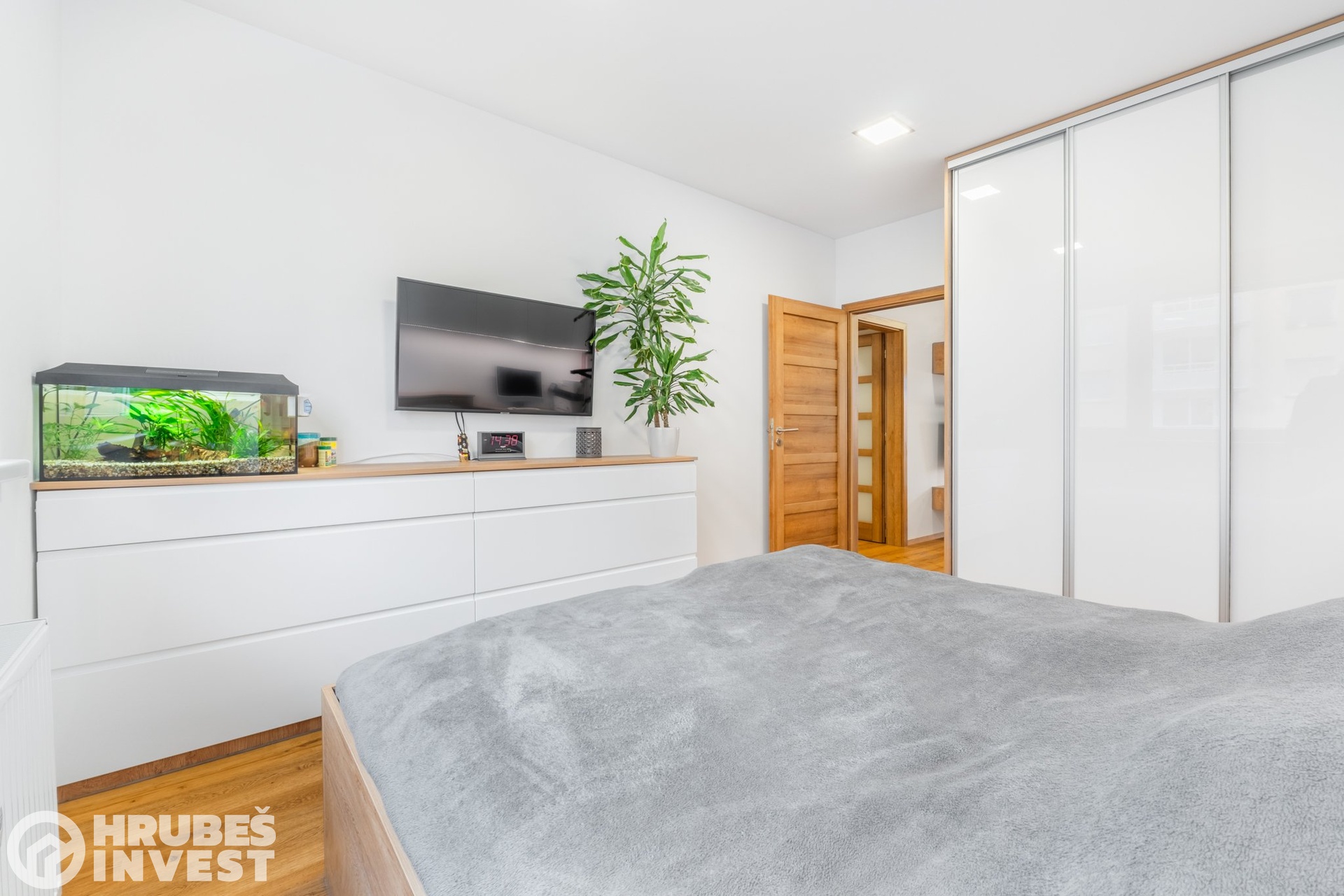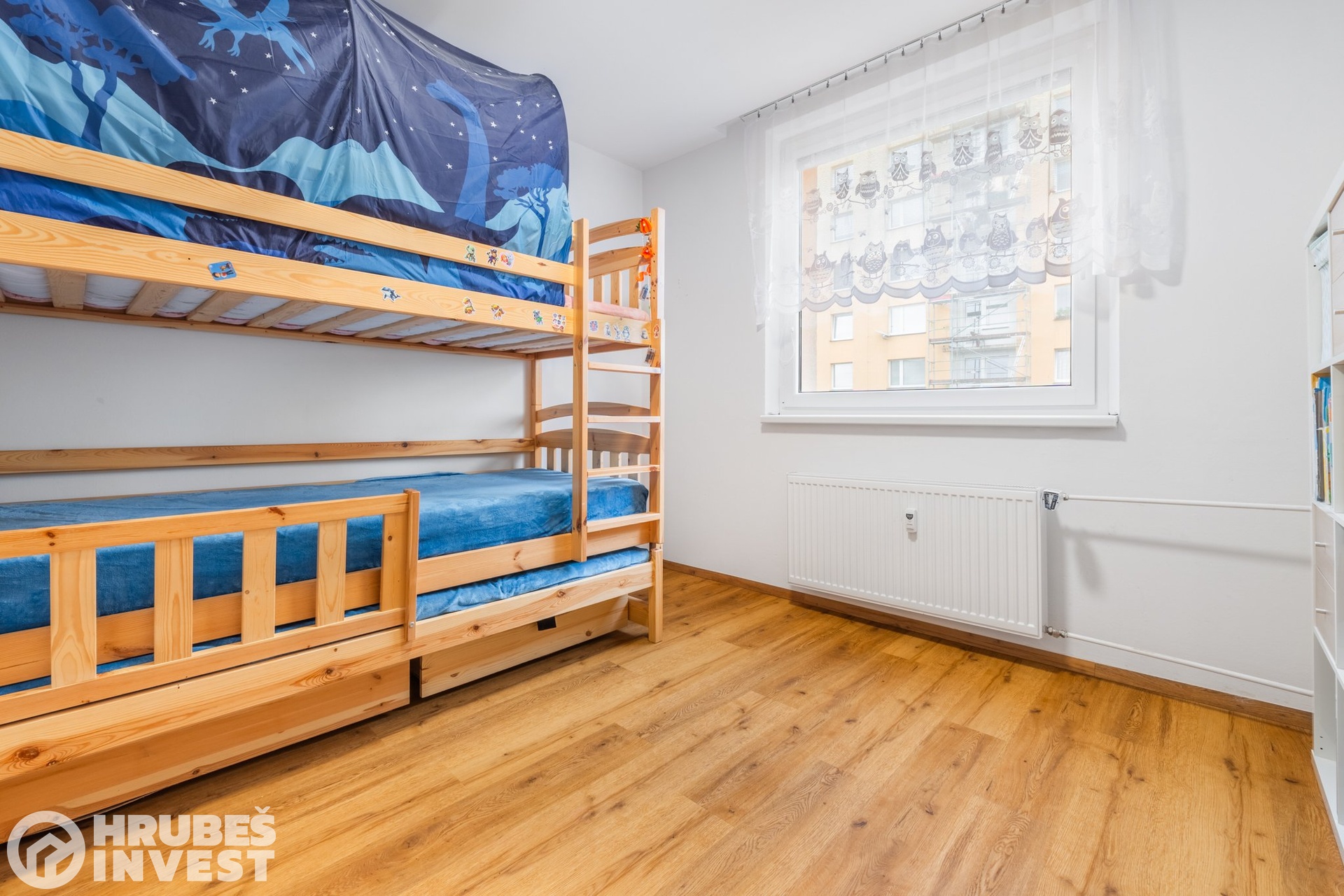 Ložnice má prakticky řešený pracovní kout, dětský pokoj působí útulně a chodba poskytuje množství úložného prostoru. Je zde kombinace vinylové podlahy a dlažby.